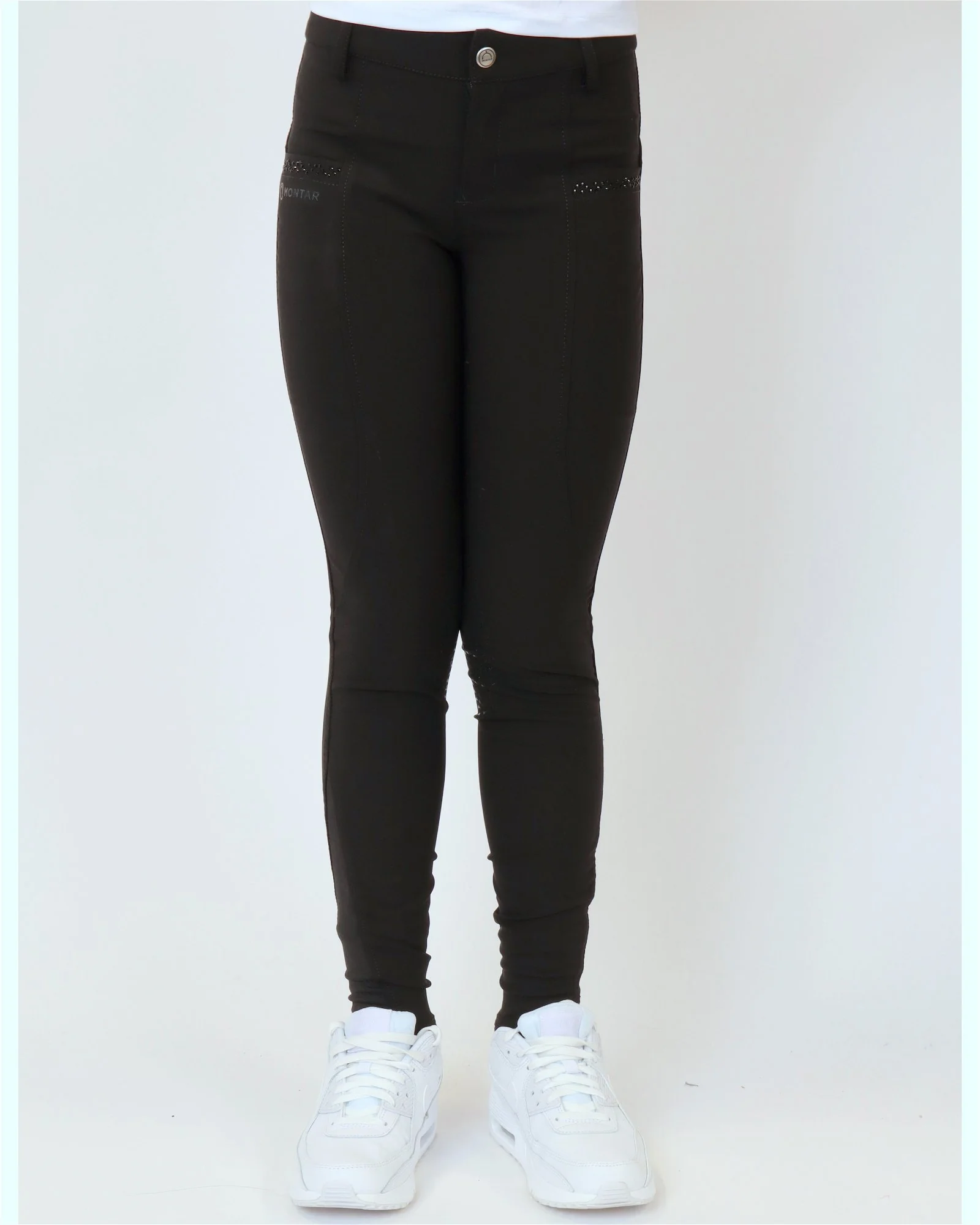 El pantalón Montar Junior está decorado con 3 filas de pequeños cristales tono sobre tono en los muslos que le dan un aspecto muy elegante junto con todas las características funcionales. Perfectos para los jóvenes jinetes activos.